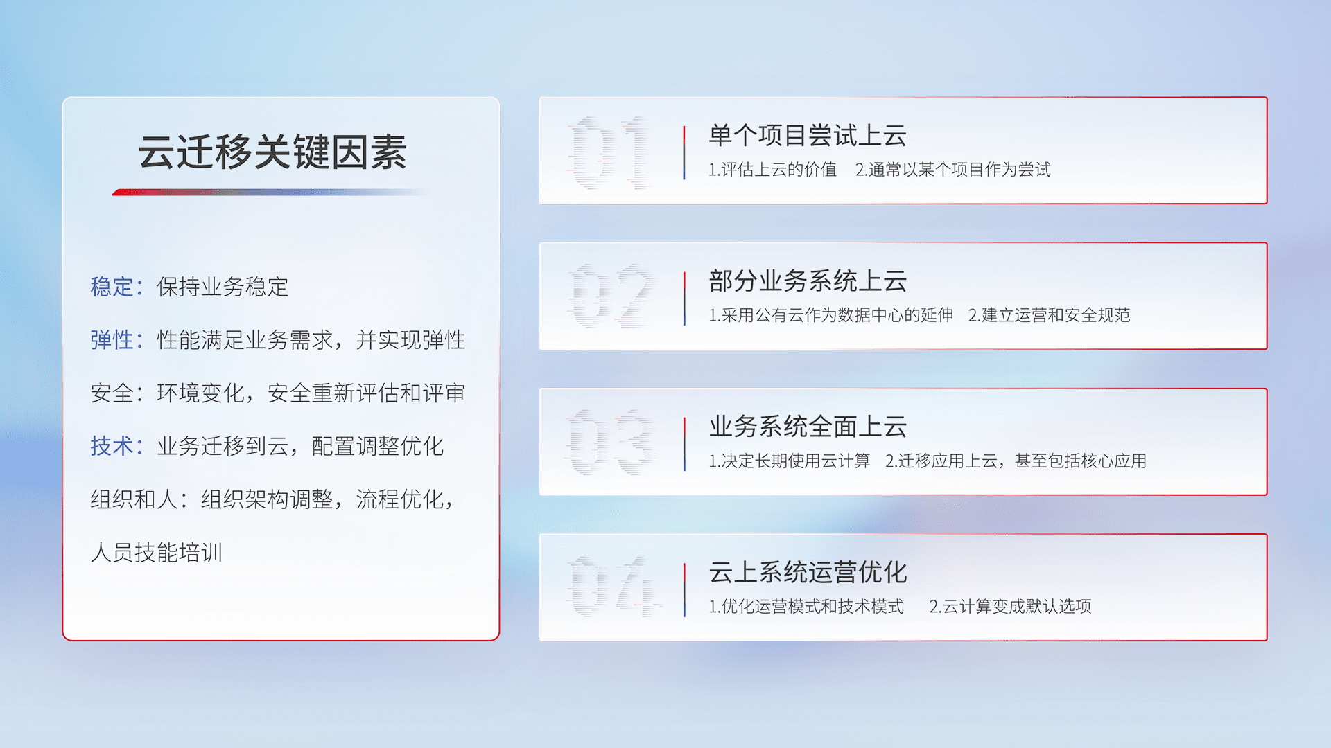 结合实际业务,,,从规划设计、、、、云平台选型、、、、云原生改造、、数据迁移、、、集成交付,,,迁移全过程为客户识别最佳上云路径,,,,做好风险识别管理,,,设计网络架构、、、、身份权限、、安全审计合规、、、、操作审计、、、日志审计、、监控告警策略、、多站点容灾设计等,,,对云上基础设施进行整体规划,,,,提升IT治理水平,,,以满足弹性、、高可用、、高性能的需求。。。。