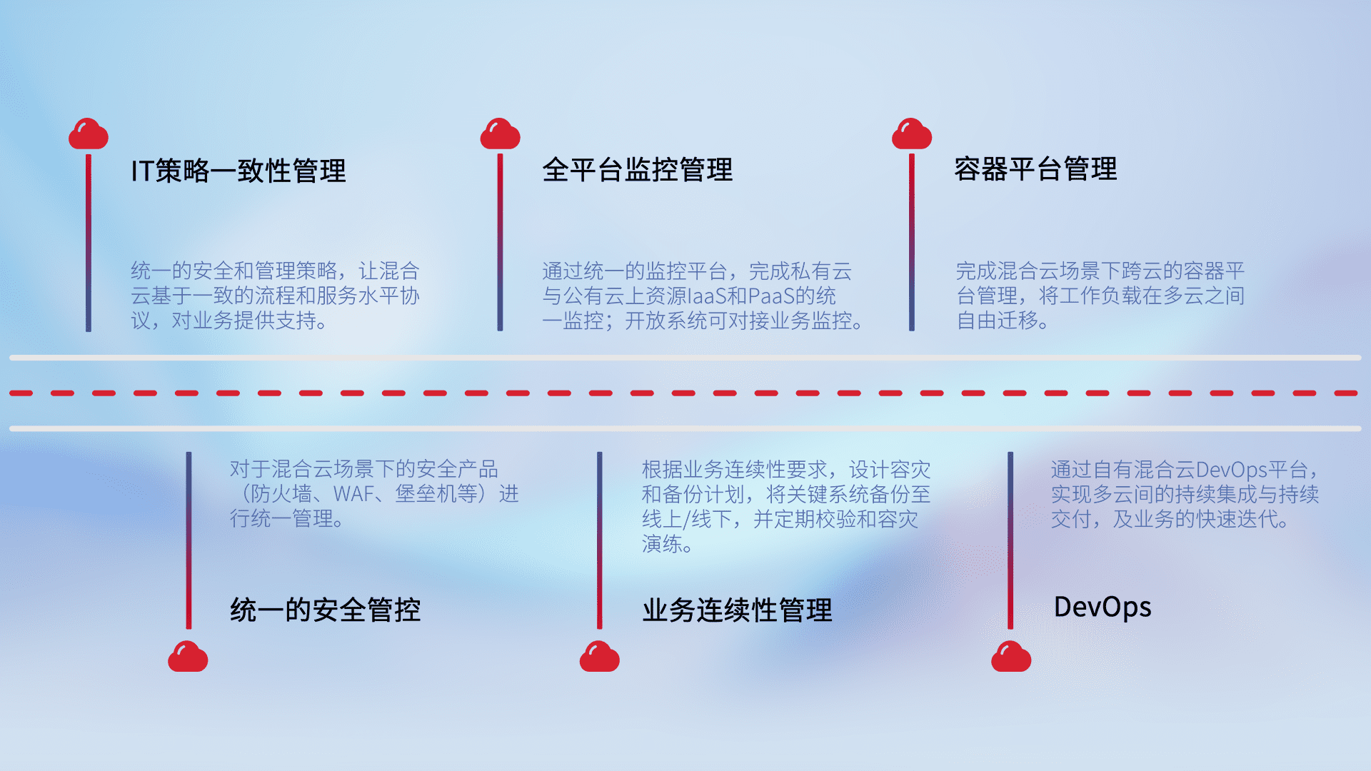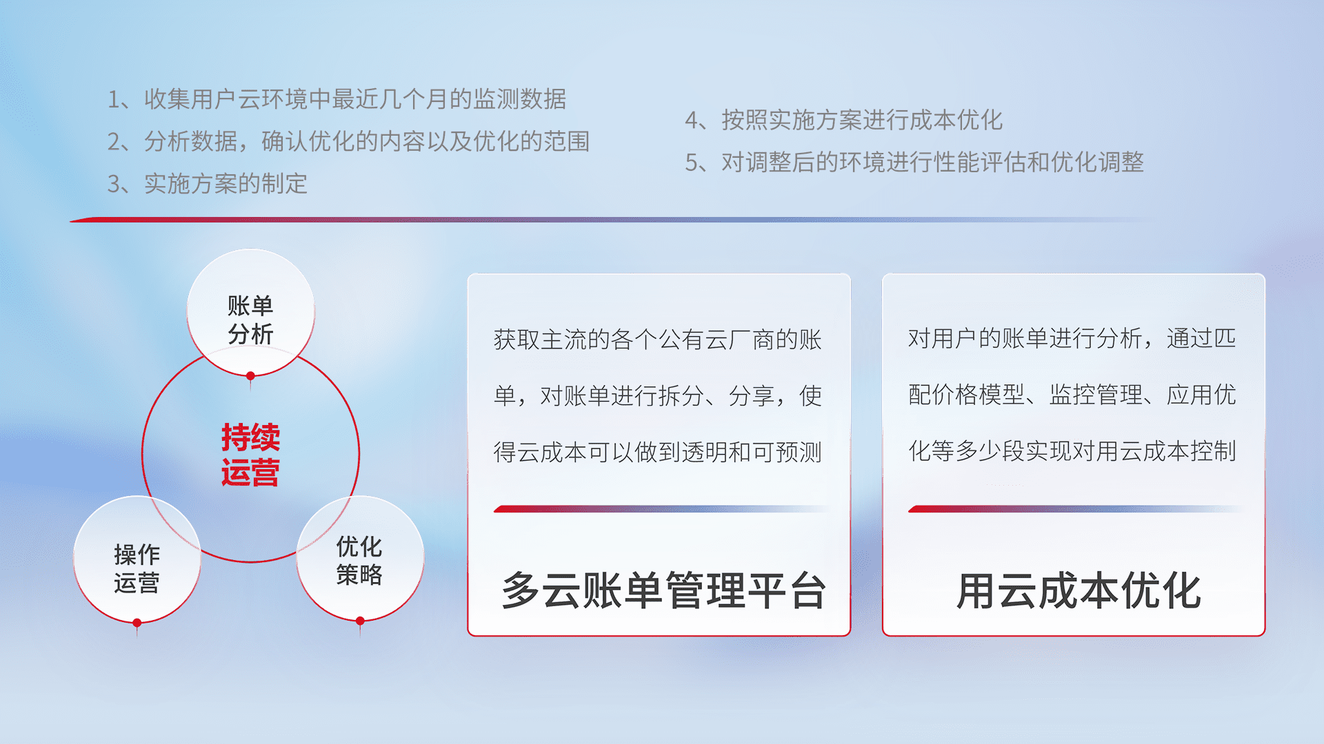 通过多云纳管,,,以统一的资源数据模型把客户的云资源进行抽象和封装,,,进而实现对多云资源的统一操作,,,保障云资源管理的可靠性、、、稳定性与可用性。。。量身定制化运维内容,,配置、、、、开发运维、、、、补丁管理、、备份、、、、监控、、、认证和访问管理、、、审计和日常巡检等,,保障在用云过程中的可靠度,,,,稳定度以及高可用率。。。。