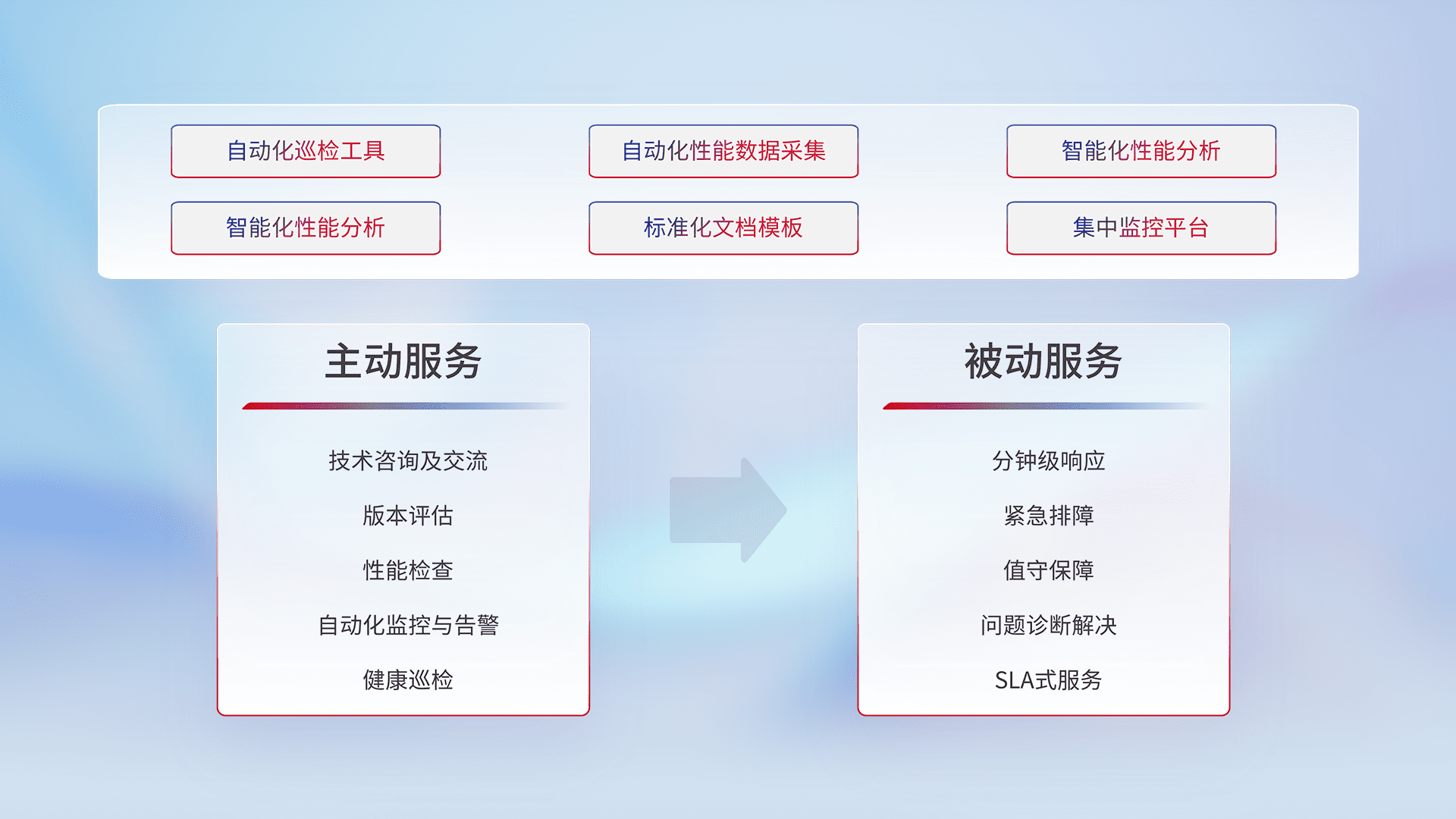 智能化工具和标准化文档,,,保障服务质量,,,提供主动服务(包含技术咨询、、、版本评估、、、性能检查、、、自动化监控与告警、、健康巡检)和被动服务包含(分钟级响应、、、紧急排障、、值守保障、、、问题诊断解决、、SLA服务)。。。。